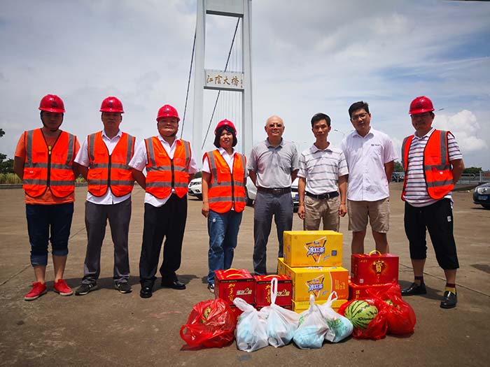在江阴大桥南锚室修补加固施工现场,陈健副总经理和唐修生总工一行慰问了施工一线的劳动者,送上清凉饮料、夏季用品,了解现场人员的工作强度和高温防暑措施等情况,嘱咐大家合理防暑,科学安排作息时间,保质保量保安全完成大桥维修工程。