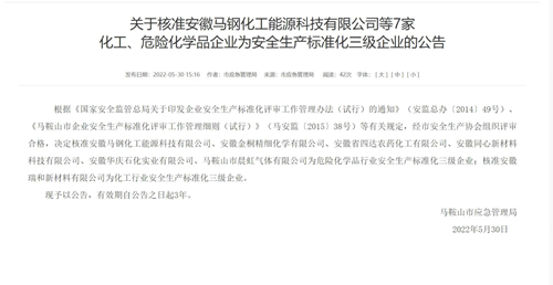 瑞和基地顺利通过化工行业安全标准化三级企业认定,是对公司安全生产管理水平肯定,将进一步推动公司安全生产工作的规范化、系统化。
